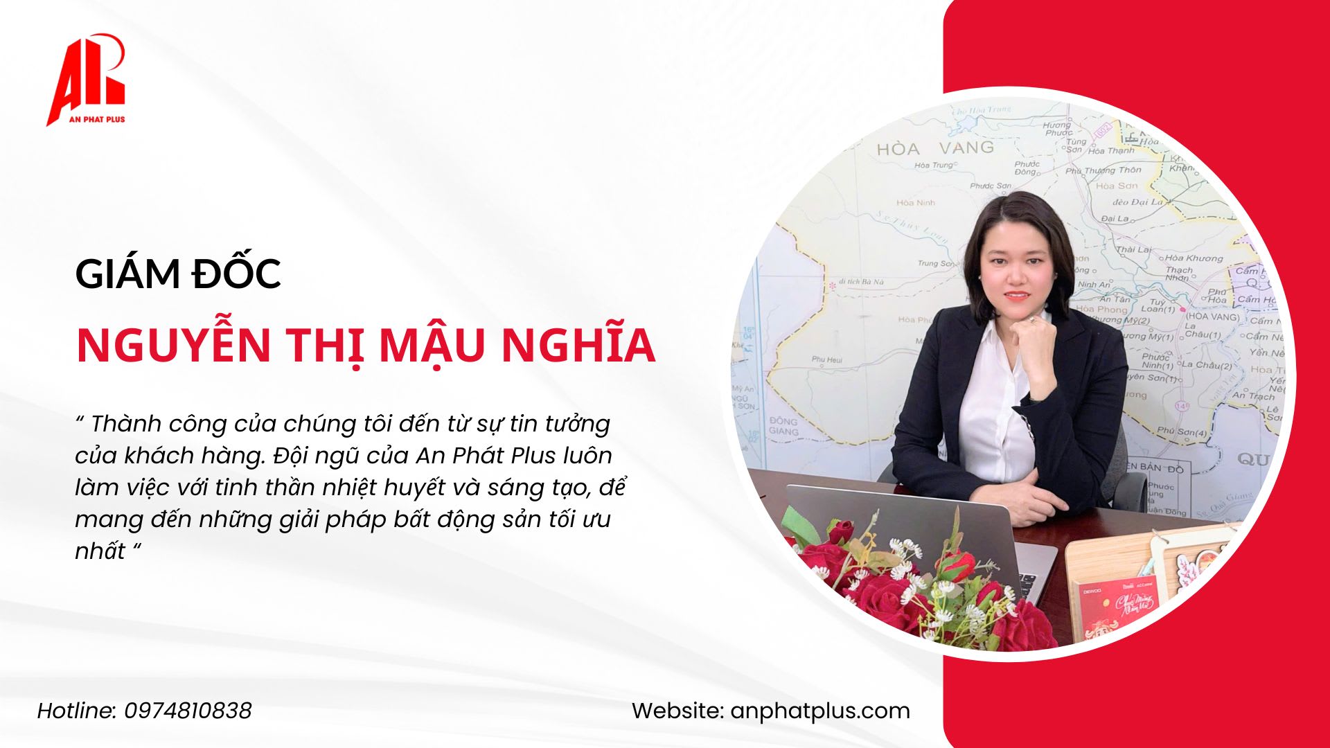 Dưới sự lãnh đạo tài tình của Giám đốc Nguyễn Thị Mậu Nghĩa, con thuyền An Phát Plus kiên cường vượt qua sóng gió. Bằng tầm nhìn chiến lược, những bước đi đúng đắn, công ty không chỉ trụ vững mà còn không ngừng phát triển, trở thành một trong những đơn vị uy tín trong lĩnh vực mua bán- cho thuê bất động sản, đặc biệt là nhà phố tại trung tâm TP Đà Nẵng.